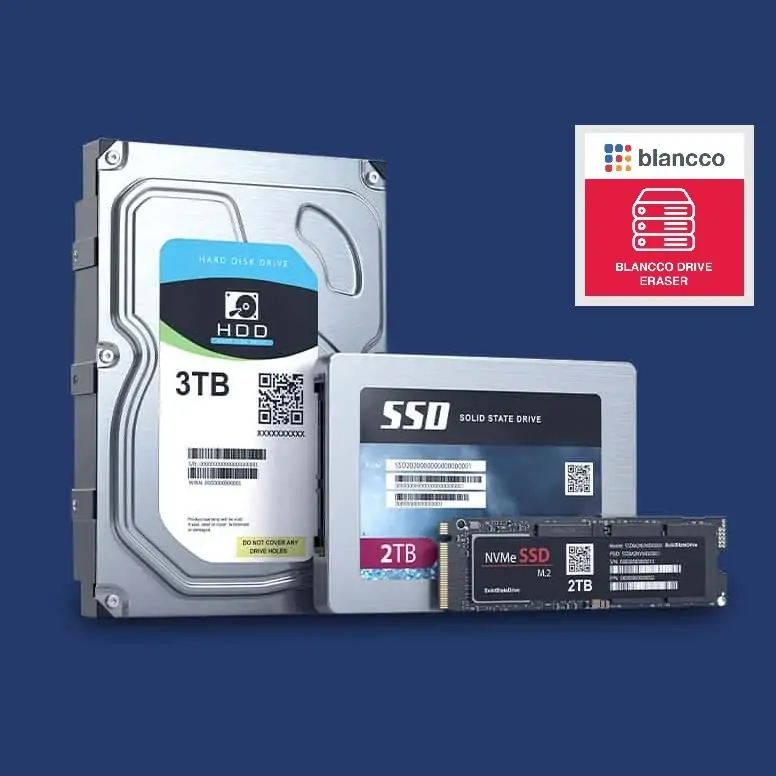 Ca cel mai testat și certificat software de ștergere a datelor din industrie, Blancco Drive Eraser oferă distrugerea datelor conform reglementărilor pentru HDD-uri, SSD-uri și NVMes pe cea mai largă gamă de dispozitive—unități separate, servere, desktop-uri și laptop-uri (inclusiv Chromebooks și computere Apple T2), și multe altele.
