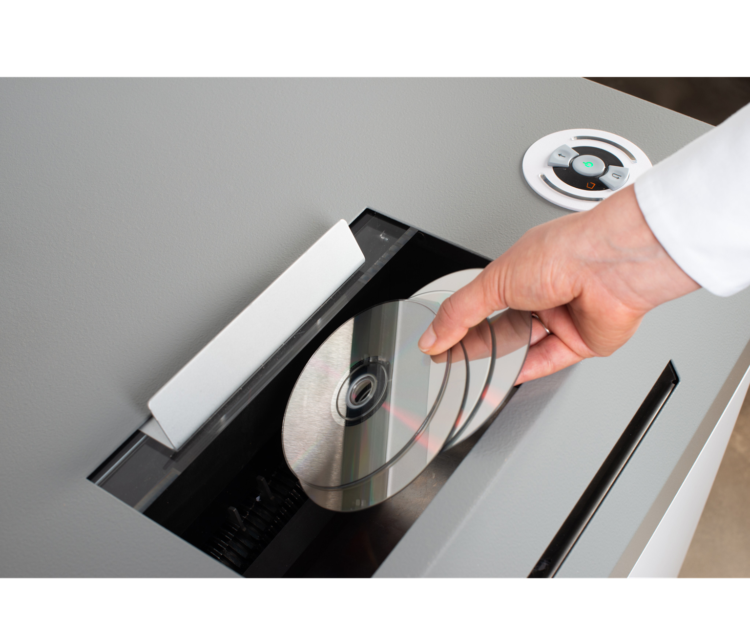 - Alimentatorul superior este conceput pentru a procesa materiale voluminoase sau neuniforme, cum ar fi hârtia mototolită, CD-urile, dischetele sau alte obiecte mai mari, permițând introducerea a 3-4 piese simultan.