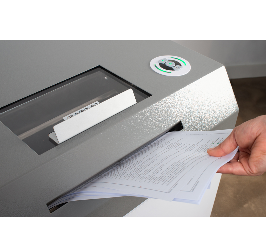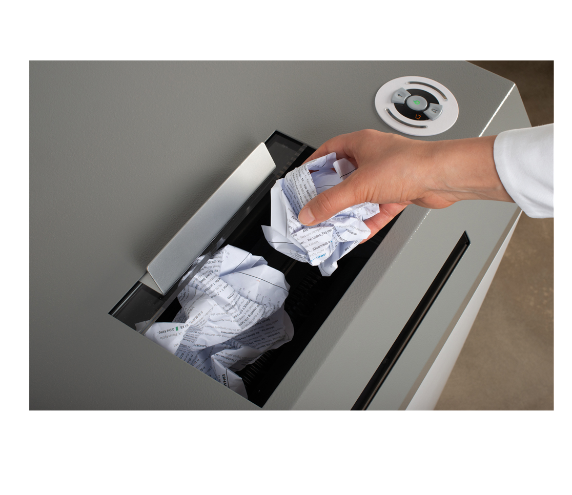 Un ușor acces la alimentare este asigurat de un capac cu ușă glisantă de înaltă calitate, care nu doar că permite o alimentare eficientă, dar și protejează utilizatorii de eventualele fragmente periculoase. De asemenea, ușa permite vizualizarea procesului de distrugere, oferind un plus de confort și siguranță în utilizare.