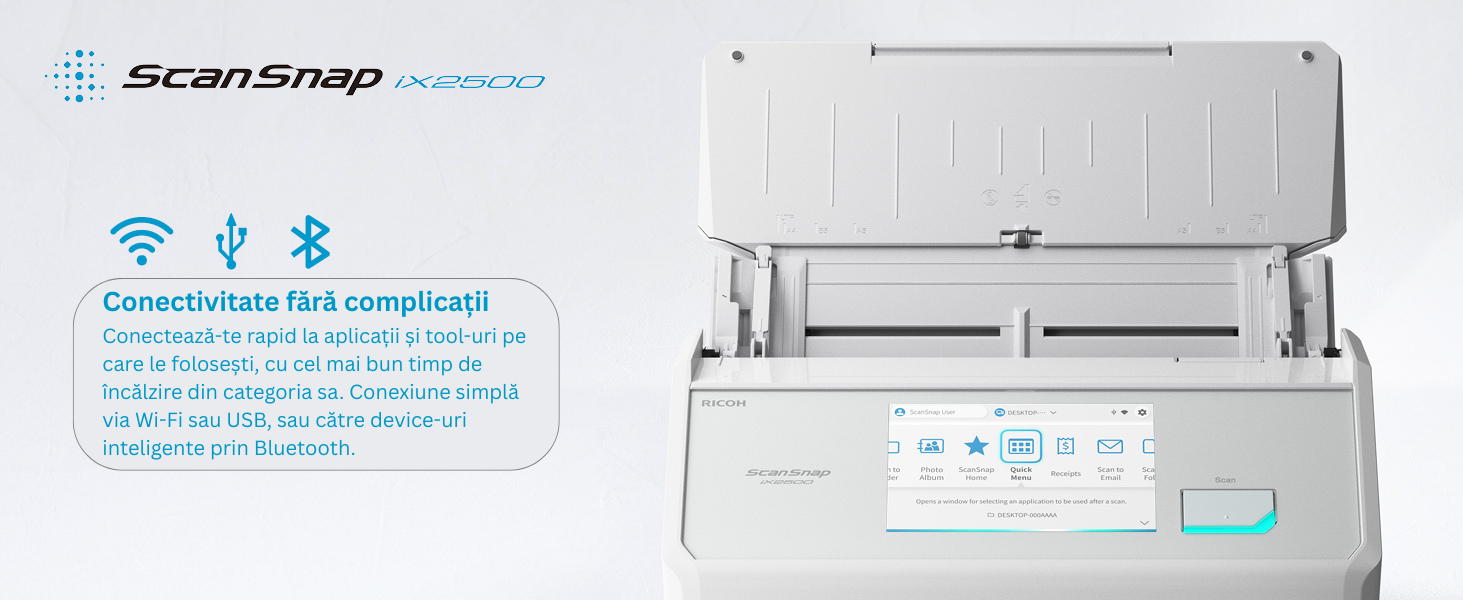 Ca cea mai conectată și convenabilă experiență de scanare oferită de ScanSnap până acum, ScanSnap iX2500 este poarta către digitalizarea vieții tale și un mod mai inteligent de a lucra. Acesta îți permite să maximizezi productivitatea personală cu un scanner care se integrează perfect în stilul tău de viață, fie că lucrezi de acasă, fie la birou.